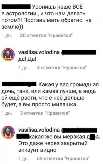 «Дочь-камаз», «громадная», «дочь-танк» – именно так выглядит ребенок Володиной в 17 лет по мнению хейтеров. Василиса не стала молча терпеть оскорбления своего единственного чада и вступилась за Викторию. Недоброжелателям не понравилось то, что девушка так легко подняла мать, да и в целом выглядит крупнее хрупкого астролога.