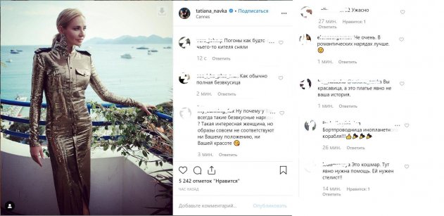 Известная фигуристка Татьяна Навка поделилась в своем профиле Instagram снимком из путешествия в курортный город Канны. На фотографии супруга российского политика Дмитрия Пескова позирует на фоне Средиземного моря в блестящем золотистом платье, которое, по мнению интернет-пользователей, подчеркнуло все недостатки фигуры Татьяны. Подписчики фигуристки начали проявлять активность и комментировать публикацию Навки. «Бортпроводница инопланетного корабля!!!», «Как обычно полная безвкусица», «Это платье явно не ваша история», «Ей срочно нужен стилист», - унизили Татьяну Навку хейтеры за нелепое платье. Многие посчитали его угловатым и несуразным, совершенно не подходящим для фигуры спортсменки.