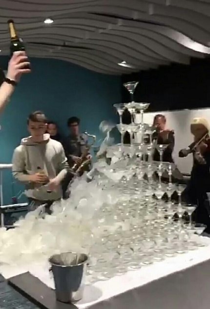 На фото видно, как незадачливый и молодой бармен наливает шампанское на самый верхний ярус пирамиды из бокалов. Однако что-то пошло не так. В один момент вся конструкция начала рушиться под торжественный аккомпанемент как карточный домик.