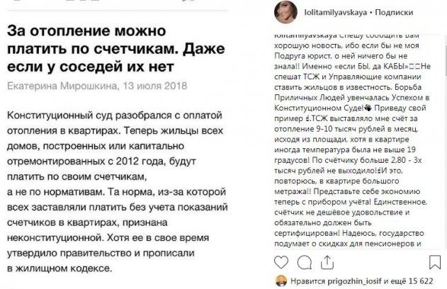 «Дежурная по борьбе с ТСЖ» призвала правительство поддержать систему скидок для пенсионеров и малообеспеченных семей, чтобы они могли приобрести счетчики и не переплачивать. «Разведем ТСЖ законом», - призвали благодарные подписчики певицы «друзей по несчастью».