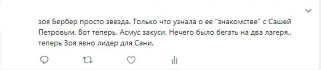 В соцсети поклонники тоже приметили необычайные факты и публикуют свои догадки в Twitter, со словами «Асмус закуси». Таким образом, Зоя Бербер в ближайшее время не выйдет замуж из-за отношений с Александром Петровым.