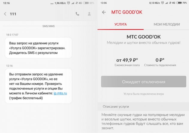 Буквально, произошло следующее, клиенту МТС пришло сообщение, что ему вместо гудков подключили мелодию. Абонент сразу же попытался ее отключить, зарегистрировал заявку, а в ответ пришло уведомление, что отключить GOOD’OK в МТС не могут потому, что услуга не подключена. При этом в Личном кабинете высвечивается запись, что услуга ждет отключения. То есть оператор утверждает, что то, что человек видит собственными глазами на самом деле не существует.