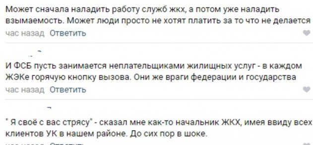 Тем не менее, жители города и области полагают, что законодательное или «ручное» давление на ЖКХ пойдёт им только во вред. Уже сейчас многие представители поставщиков услуг пытаются любыми способами добиться платежей по непомерно возросшим тарифам. Горожане жалуются на некоторых руководителей-коммунальщиков, неприкрыто угрожавших: «Я своё из вас вытрясу!». При этом многие уверяют, что качество услуг не соответствует их цене – люди просто не хотят платить за несуществующее. В социальной цепочке руководство области-поставщики услуг ЖКХ-потребители, крайними непременно окажутся простые люди. Всё это провоцирует рост недовольства жителей, иронично предлагающие задействовать ФСБ против злостных неплательщиков.