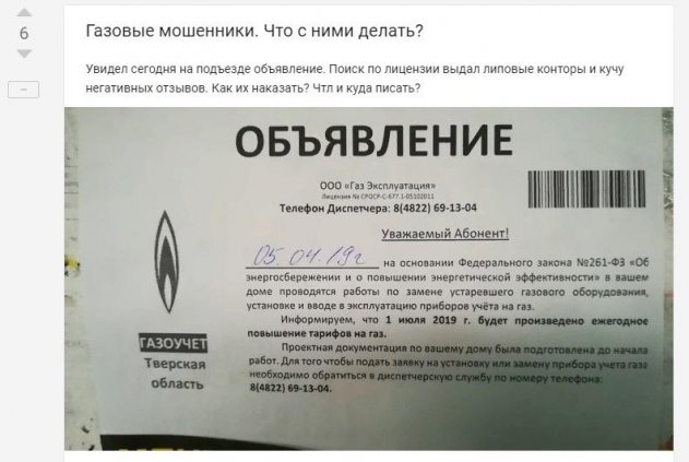 К примеру, в Твери местные жители увидели на своём доме объявление с предупреждением о грядущем повышении цен на газ и необходимости замены учётного оборудования. Фото обращения к жильцам дома от имени фирмы «ГАЗ ЭКСПЛУАТАЦИЯ» появилось на портале Pikabu.