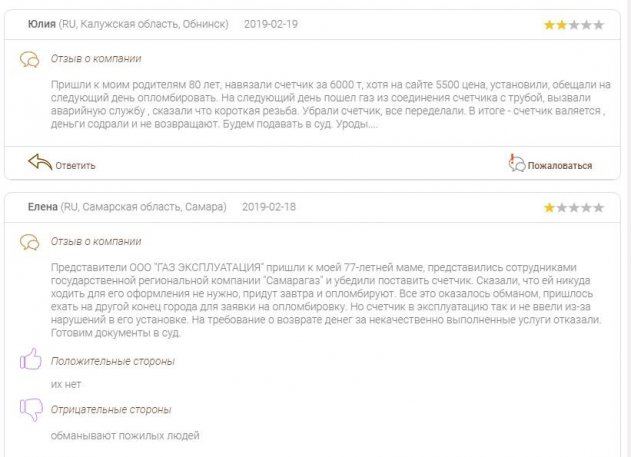 Как выяснилось, данная строительная компания уже давно под видом службы газа втридорога торгует счётчиками по всей России. Так, в сети полно негативных отзывов от жителей Москвы, Челябинска, Самары и прочих городов, где говорится, что сотрудники «ГАЗ ЭКСПЛУАТАЦИЯ» представляются газовиками, ходят по квартирам и нагло «кидают» пенсионеров.