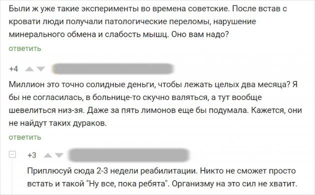 Космическое агентство NASA пообещало более миллиона рублей той девушке, которая сможет провести два месяца, совсем не вставая с кровати. В эксперименте может принять участие девушка из любой страны, если её кандидатура подойдёт организаторам по ряду критериев. Так, возраст испытуемой должен быть не старше 55 и не младше 24 лет, рост должен составлять 155-190 см, а индекс массы тела попадать в диапазон от 19 до 30. Критерии кажутся довольно простыми для соответствия им, поэтому многих девушек, которые грезят о лёгких деньгах, предложение от NASA должно было мгновенно увлечь. Однако потенциальные кандидатки из России неожиданно выступили против эксперимента.