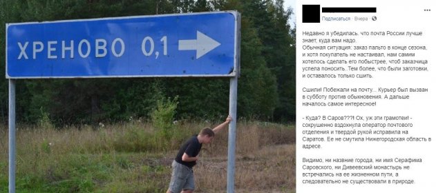 Курьер привёз пальто в почтовое отделение, где оператор решил, что ему лучше знать, куда следует отправить посылку. «Куда? В Саров???! Ох, уж эти грамотеи! - сокрушенно вздохнула оператор почтового отделения и твердой рукой исправила на Саратов. Ее не смутила Нижегородская область в адресе», - пересказывает историю сотрудница интернет-магазина у себя в Facebook, дав понять, что сотрудники почтовой службы не знают, какая разница между двумя городами.