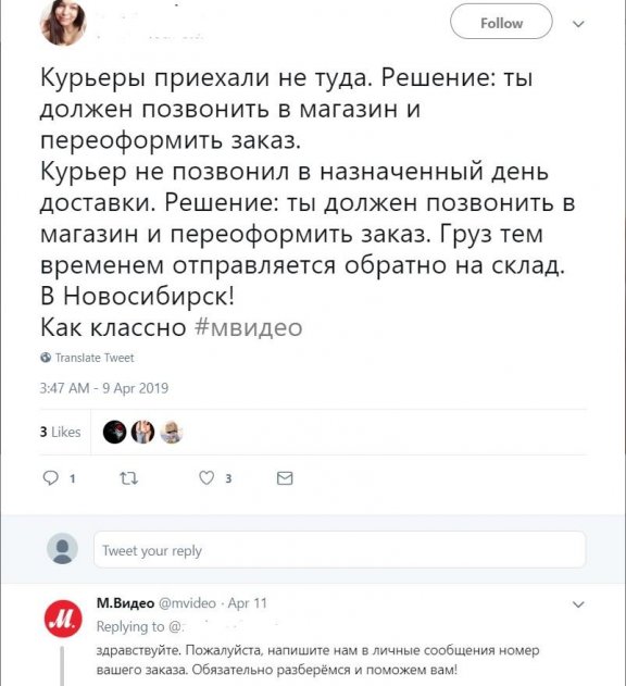 Стоит отметить, что менеджеры сети МВидео действительно оперативно реагируют на публикацию бесчисленных жалоб в социальны сетях. Но, как ни парадоксально, меньше их от этого становится.