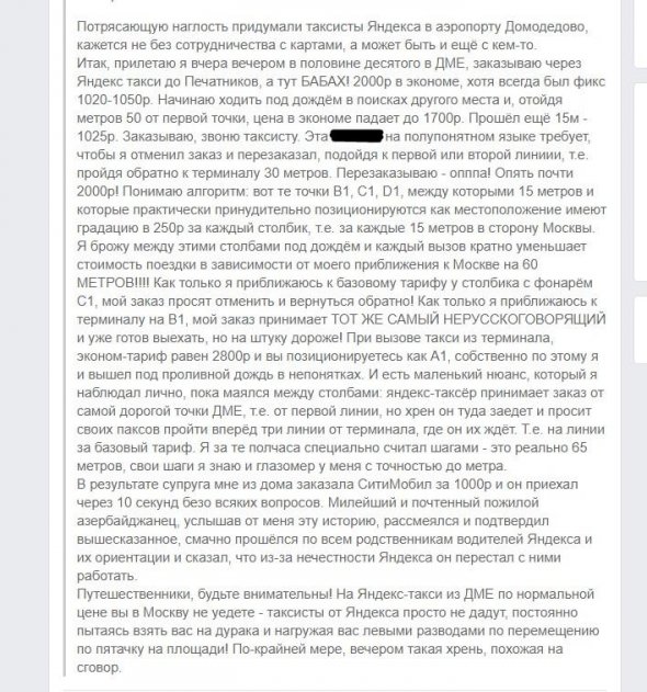 Как поведал один из пассажиров, с подобной уловкой он столкнулся после прибытия в аэропорт вечерним рейсом. Заказывая такси, мужчина был неприятно удивлён тому, что стоимость поездки из терминала в приложении «Яндекс.Такси» в два раза превышает известную ему фиксированную стоимость по данному маршруту. Однако самое интересное ожидало впереди. Стоило только отойти на 50 метров от изначальной точки, как цена на поездку снизилась с 2000 рулей до 1700, а ещё через 15 метров – до 1025 рублей. Довольный собой мужчина заказал машину, но всё оказалось не так просто. Водитель такси отказался забирать пассажира из этой точки и потребовал вернуться к той, откуда стоимость поездки оценивается в 2000 рублей.