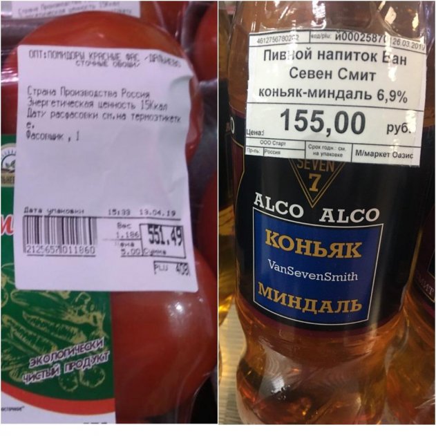 В качестве ещё одного примера, в одном из супермаркетов была запечатлена цена на 4 помидора, местного производства с пометкой «экологически чистый продукт», которая составила 551 рубль 49 копеек. На ещё одном фото, можно увидеть цену на пивной напиток, российского производства, но за цену 155 рублей. Цена помидоров в 3,5 раза превышает цену на алкогольсодержащий продукт.