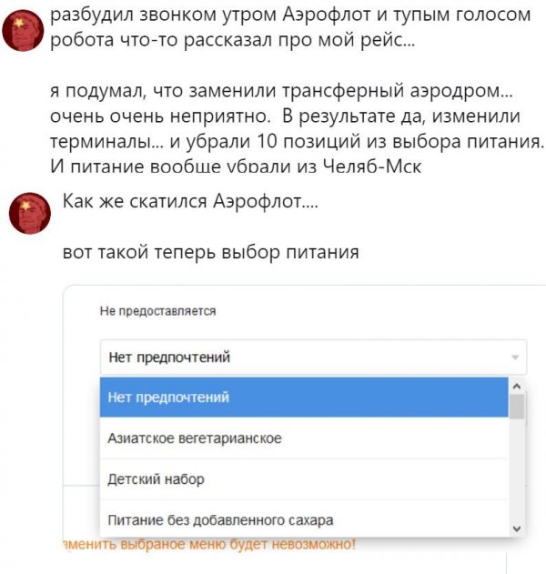 Но, очевидно, не настолько хорошо, чтобы позволить пассажирам насладиться всеми преимуществами путешествия «Аэрофлотом». Так, пассажиры неожиданно для себя узнали, что компания сократила меню – прямо в преддверии сезона отпусков. Новость стала настолько неприятной для клиентов авиаперевозчика, что некоторые уже готовятся голодать в вынужденных перелётах «Аэрофлотом».
