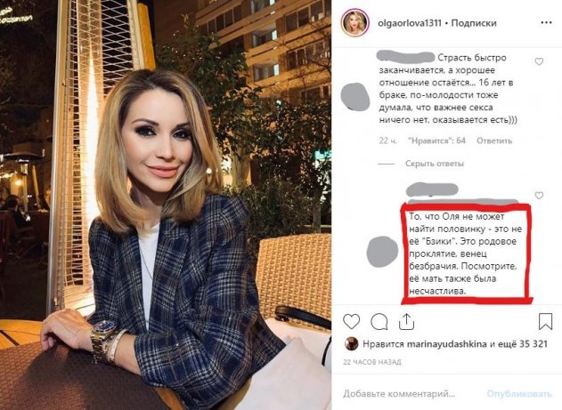 Но на официальной странице Ольги в Instagram появилась информация от экстрасенса, который заявил, что телезвезда одинока не из-за собственных «бзиков», а потому, что носит «венец безбрачия». К тому же, эксперт выявил родовое проклятие Орловой, заявив, что её мать, Галина Егоровна, также не смогла обрести семейное счастье.