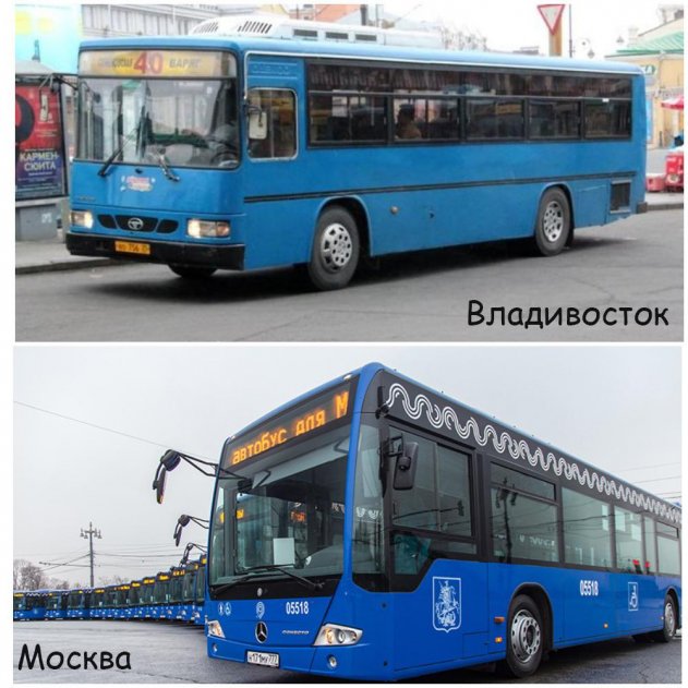Все улучшения и изменения происходят только внутри городов федерального значения, таких как Москва и Санкт-Петербург. Для сравнения, московские автобусы разительно отличаются от Владивостоксих. Они все новые, современные, оборудованные вайфаем, местами для инвалидов и специальными выдвижными пандусами для колясочников. Все они курсируют строго согласно расписанию, отображаемому на электронных таблоидах, установленных на каждой остановке.