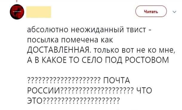 В своем Twitter москвичка пожаловалась на «абсолютно неожиданный твист» «Почты России». Она рассказала, что отслеживала свою посылку через сайт, а когда увидела в графе состояния «город Москва» - обрадовалась. Однако уже на следующий день девушка обнаружила, что доставка продолжила свой путь и оказалась в Ростове-на-Дону. Позже стало понятно, что долгожданную посылку доставили, вот только не ей. По словам рассерженной клиентки, «Почта России» перепутала Москву с селом под Ростовом.