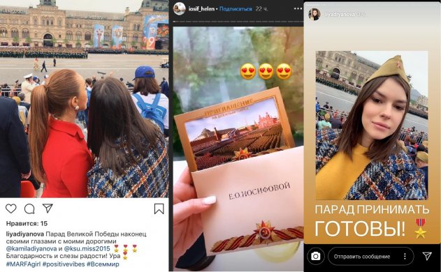 Так, главными целями для шквала критики стали Александра Маркина, Лия Диянова и Елена Иосифова, каждая из которых получила именной пригласительный билет. Стоит отметить, что в адрес некоторых критика была необоснованной. Например, Иосифова получила билет как родственница ветерана – на Парад девушка привела свою бабушку. Другие Instagram-модели попытались оправдать своё присутствие благотворительность, хотя сегодня за ней чаще прячутся граждане, желающие сэкономить на налогах, а не помочь нуждающимся.
