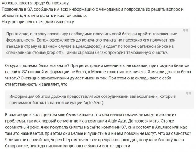 Что произошло на самом деле: в своих ответах пассажирке S7 Airlines проявила компетентность. На сайте перевозчика действительно указано, что существуют разные правила осуществления международных рейсов. Об этом напоминает сайт Домодедово. По закону так называемые совместные рейсы, где участвуют две и больше авиакомпаний, определяют порядок действия совместно. С ним, в случае совершения первого перелёта таким способом, через новый аэропорт или новым перевозчиком, пассажир должен ознакомиться самостоятельно.