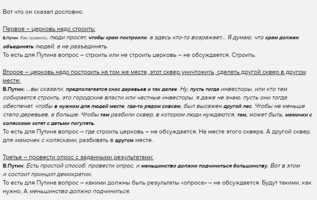 Путин приказал снести сквер, а на его месте построить церковь, с пеной у рта доказывает экономист, посвятивший тщательному разбору «речи», судя по всему, немало времени и сил. В качестве доказательств автор привёл слова Путина: «Как правило, люди просят, чтобы храм построили, а здесь кто-то возражает… Я думаю, что храм должен объединять людей, а не разъединять». По мнению Илларионова, эта фраза, как нельзя прекрасно говорит о том, что вопрос строительства храма в принципе не обсуждается, потому что он будет возведён в любом случае.