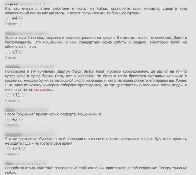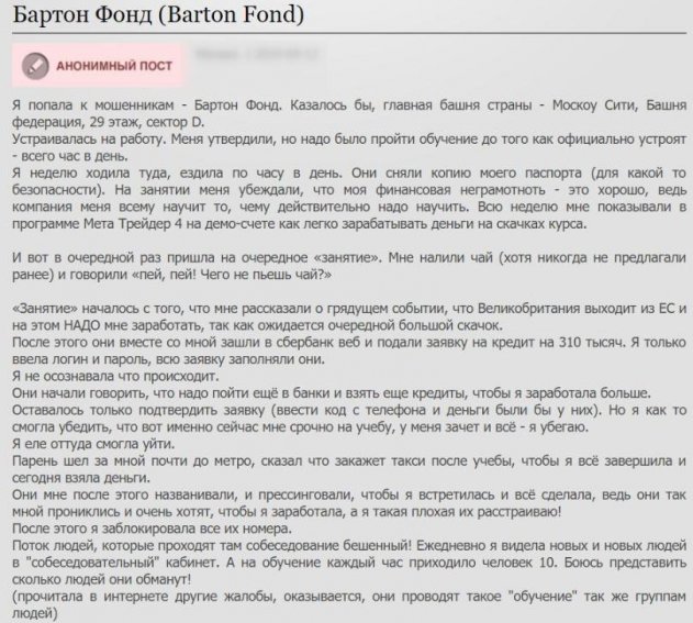 Потом барышню пригласили в чистый и опрятный кабинет, в котором девушка с обаятельной улыбкой задала дежурные вопросы в духе «чего хотите от жизни?», «устраивает ли предложенная зарплата?», «готовы ли к командной работе?», а далее возместила о том, что после пяти дней обучения по часу в день кандидатка может приступить к работе – а в это время в коридоре стояли толпы людей. Недоверчивая москвичка порылась в Сети, почитала комментарии и по счастливой случайности наткнулась на отзыв, в котором шла речь об этой фирме «Бартон фонд». Оказалось, что в течение пяти дней «работодатели» заставляют «работника» создать счет, взять на себя кредиты, положить их на счет и потом «слить» это счет компании. Дескать, это инвестиция, вложение, которое даст плоды. К сожалению, не все оказались прозорливы, как героиня истории.