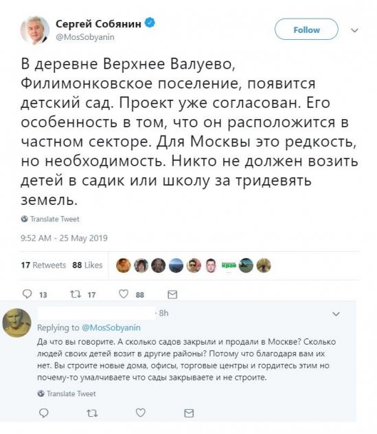 Видимо поэтому «радостная весть» Собянина весьма озадачила некоторых жителей столицы, которые не могли не поинтересоваться у мэра, скольким людям сейчас приходится возить детей в другие районы ради детских садов, которых нет у них – у простых людей. По мнению пользователей, связана такая нехватка мест и учреждений с деятельностью мэра, который «строит новые дома, офисы, торговые центры и гордится этим», но умолачивает, что одни сады закрываются, а другие не строятся.