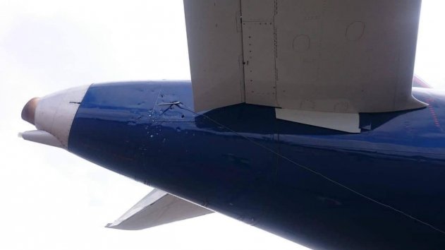 Проблема оказалась в тросе заземления, который не был убран при взлете судна. Провод необходим для удаления статического электричества, которое накапливает самолет во время трения о воздух. Один конец крепится за сам борт, а другой за штырь находящийся на земле.