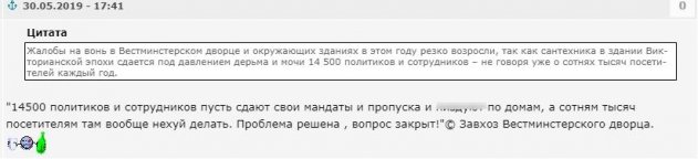 Пока правительство Великобритании мучительно пытается разобраться с Brexit, парламент Соединенного Королевства продолжает тонуть в фекалиях. Здание времен королевы Виктории нуждается в срочном ремонте, однако, видимо, у Кабмина более глобальные задачи. Мужской туалет и туалет для прессы работает по графику «неделя через две», но даже и в рабочее время на полу парламентских уборных стоят лужи, и это не разлитая вода. Вестминстерский дворец, в котором располагаются депутаты, одно из немногих зданий, которое еще не превратилось в декоративный памятник архитектуры XIX века. Члены палаты общин не скрывают, что парламент нужно срочно реставрировать, но все технические проблемы, в том числе и с сантехникой, по их словам, оперативно устраняются. Осведомленные в сложившейся ситуации эксперты поясняют – парламент тонет в испражнениях из-за выхода в метрополитен. Отмечается, что в этом теплом проходе нередко ночуют бездомные, и справляют там естественную нужду, а иногда и устраивают попойки.