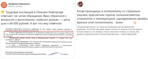 В России врачей ставят в неудобное положение бюрократия и чиновничье равнодушие. Например, как передаёт Профсоюз Навального, в Нижнем Новгороде врач обратился в местную инспекцию, требуя свои законные 64 тыс. рублей зарплаты. В отписке чиновники говорят о каких-то 42 тыс. рублей, очевидно, даже не вчитавшись в письмо.