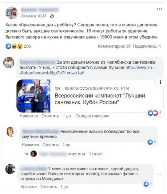 По его словам, ему потребовалось удалить бытовой засор на кухне, однако заплатил автор рассказа 19900 рублей за 15 минут работы. По его словам, такой хороший заработок говорит о том, какую же профессию следует выбирать. В комментариях мужчине сказали, что за эти деньги он может вызвать себе бригаду сантехников, например, из Челябинска и это будет дешевле.