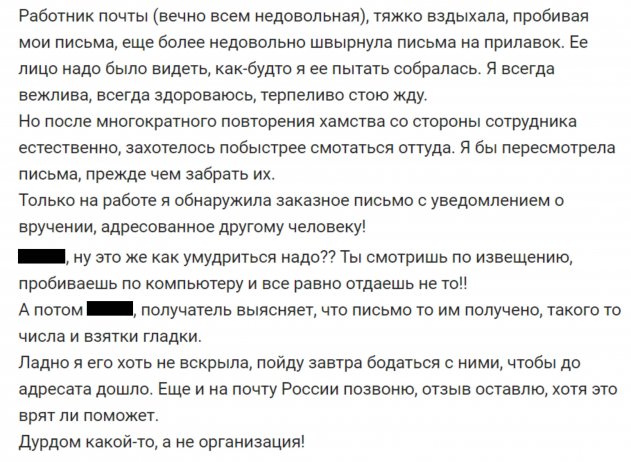У посетительницы не осталось терпения, чтобы удержаться от нецензурной брани в сторону сотрудников Почты России. Судя по уведомлению, клиенту письмо вручили, а по факту – почтовое отправление забрал другой человек. «Дурдом какой-то!»: клиентка Почты России возмущена, что ей вручили чужое письмо.