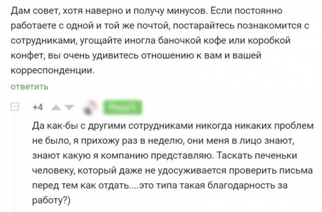 Историю активно комментировали другие клиенты Почты России, рассказывая о своём взаимодействии с организацией. В качестве совета, «бывалые» клиенты посоветовали героине подружиться с работниками.