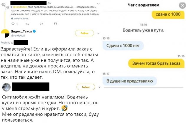 С какими только людьми клиентам такси не приходится ездить каждый день. Судя по отзывам в Twitter, водители «Ситимобил» и «Яндекс.Такси» выпрашивают у клиентов сигареты и наличные. Непонятно, на что рассчитывают эти нарушители в эпоху интернета? Любой промах с их стороны тут же разлетается в сети, в частности в Twitter.