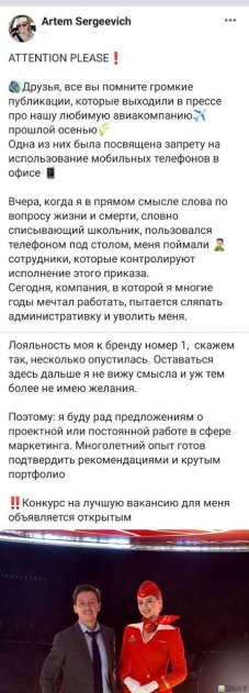 Очевидно, «Аэрофлот» не обращает внимание не только на личные права и свободы пассажиров, но и с таким же хладнокровием относится к собственным рабочим. Отметим, что на странице в Facebook поста с жалобой нет. Возможно, его удалил сам Артём, или компания заставила его так поступить, пригрозив испортить репутацию – пост маркетолог «Аэрофлота» выложил с просьбой предложить ему работу в другой компании.