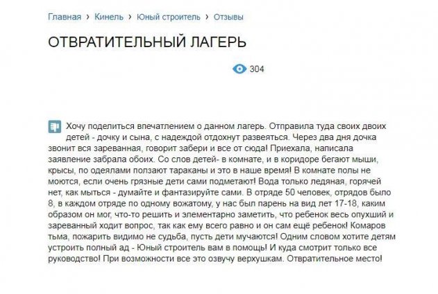 Так, множество отзывов на независимых сайтах и в соцсетях бьют тревогу, и призывают никогда не отправлять туда своих детей. Иначе это нанесет непоправимый вред их психическому, а если не повезет, то еще и физическому, здоровью. Так, один из неравнодушных граждан разместил в соцсетях обращение к муниципалитету Самары, чтобы те внимательно рассмотрели то, что творит в детском лагере. И, естественно, приняли меры, ведь условия для жизни просто ужасные. Также можно привести в пример одну из мам, которая написала отзыв о том, что «Юный строитель» превратился в приют для тараканов и крыс, а дети были вынуждены сами подметать грязный пол, ведь этим никто не занимался.