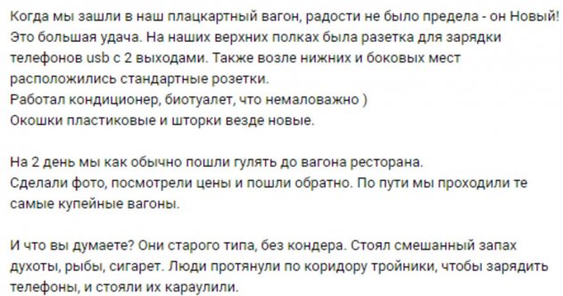Тем не менее, очевидцы рассказывают, что в поездах, которыми им доводилось пользоваться, парадоксально уживаются новые плацкартные вагоны с кондиционерами и старые купейные, где царит духота, застоявшийся воздух и антисанитария. Пассажиры откровенно говорят, что лучше сдохнуть, чем доехать в такой «душегубке». После такой поездки, они дают себе обещание на следующий год обязательно воспользоваться услугами авиаперевозчика.