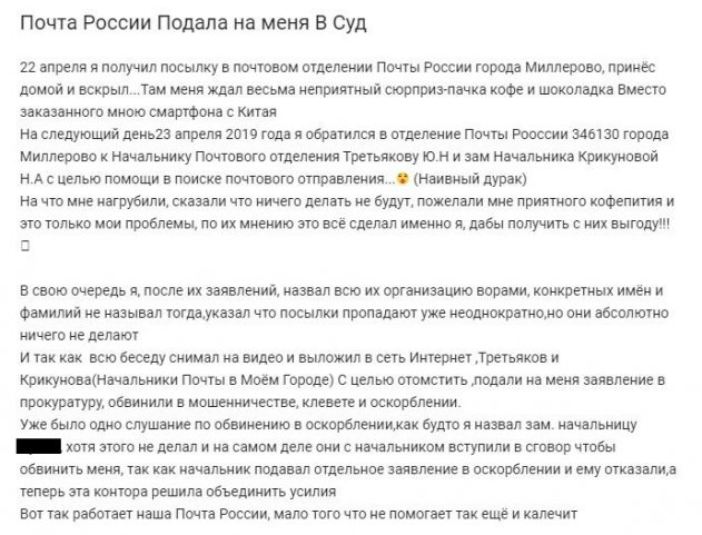 Недолго думая, сотрудники компании подали на мужчину заявление в прокуратуру, обвинив в мошенничестве, клевете и оскорблении, хотя клиент всячески отрицает это. Один иск, как утверждает автор, суд уже отклонил, но «Почта России» не сдаётся и все «оскорблённые» сотрудники уже объединили усилия в попытке наказать пострадавшего.
