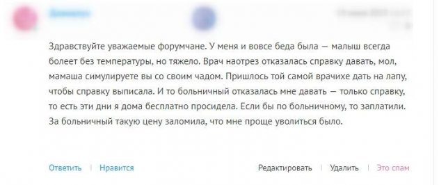 Подписчики на форумах жалуются: медики не стесняясь обвиняют маленьких пациентов и их родителей в симуляции, отказываются давать больничные листы бесплатно, не стесняясь, подначивают – нарожали – теперь платите или не наши проблемы. И приходится мамам и папам не просто поддерживать, а становится участниками коррупционной схемы.