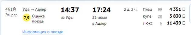 Цена за два рейса - Уфа-Адлер и Адлер-Уфа, составила, согласно прейскуранту РЖД, около 8600 рублей и, по правилам, ей должны были вернуть практически полную стоимость, без учёта сервисных наценок.