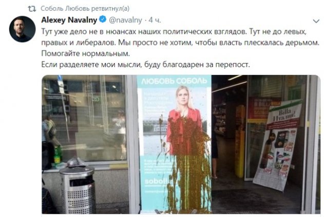 Блогер Алексей Навальный опубликовал в своём Твиттере пост, посвященный «атаке на агитационные ларьки» его приспешницы Любви Соболь. Он узрел в «туалетном» инциденте следы столичной мэрии. По его мнению, акция направлена на дискредитацию его кандидата, чтобы окончательно вывести его из предвыборной гонки». Навальный намекает, что «нормальные», по его мнению, люди обязательно поймут, кто стоит за этими провокациями и поддержат Соболь.