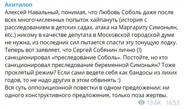 Также схожую позицию выразили авторы Telegram-канала «Акитилоп» - обвинения в столь примитивных методах мэрии Москвы выглядит по меньшей мере забавными. А попытки Любви Соболь привлечь к себе внимание, каждый раз выставляя себя жертвой, уже всем надоели.
