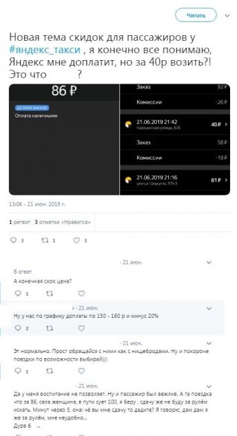 В соцсетях водитель «Яндекс.Такси» посетовал на то, что сервис дарит пассажиром слишком большие скидки и ему приходится проводить поездки по 86, а то и по 40 рублей. По его словам, сервис, конечно, доплатит ему, но подобного рода короткие поездки ему очень неудобны. Также он объяснил, что клиенты быстро привыкают к низким ценам и потом возмущаются, когда они резко возвращаются в привычное русло. А таксист, в свою очередь, в качестве оценки получает одну звезду и его рейтинг падает.