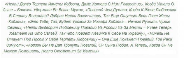 Нельзя также сбрасывать со счетов возможное желание Нелли отомстить «любовницам» мужа, в числе которых якобы Лолита и Повалий. Если предположение вдруг окажется правдой и Нелли действительно хочет захватить власть Кобзона на эстраде, чтобы уничтожить «любовниц», то не исключено, что обе артистки «подавятся карьерой». Хотя, учитывая любовь фанатов к Нелли, Милявскую с Повалий давно бы заклевали, если бы она была в этом заинтересована.