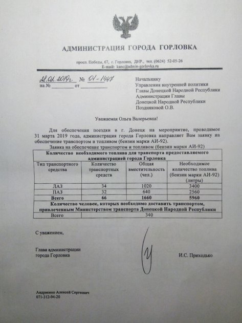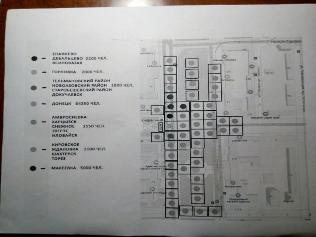 Планируется согнать на площадь Ленина в Донецке 100 тыс. человек (несмотря на то, что площадь физически не вмещает такое количество людей). Подвоз будет организован автобусами. «Дорисовывать» толпу будут многочисленные российские пропагандисты. Существует даже схема размещения людей по городам на площади (см. документы).