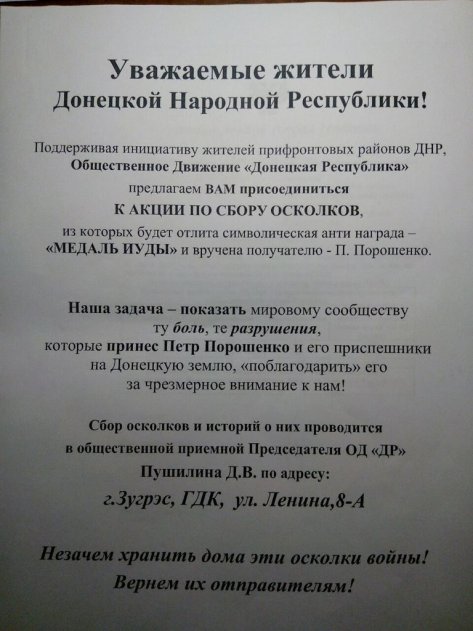 Мегапровокация под названием «орден Иуды», по замыслу организаторов, должна собрать до 100 тыс. мирных участников. Акция щедро спонсируется за счет российских налогоплательщиков. Так называемый орден планируют «вручить Порошенко», а для изготовления самого ордена объявлен сбор осколков от снарядов, которыми «Хунта обстреливает мирных жителей Донбасса» (см.скрины документов ниже).