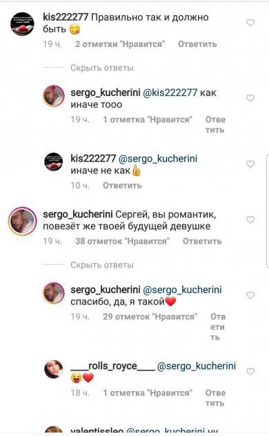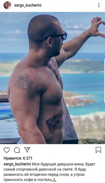Сегодня, Сергей опубликовал пост в Instagram с подписью: «Моя будущая девушка – жена, будет самой спортивной девочкой на свете. Я буду разминать ей ягодички перед сном, а утром приносить кофе в постель». Непривычно было подпись о жене под публикацией Кучерова. Самое странное, что спустя некоторое время Кучеров сам же и прокомментировал свой пост: «Сергей, вы романтик, повезет же твоей будущей жене». «Спасибо, да, я такой», - продолжил диалог сам с собой Кучеров.