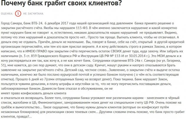 Примечательно, иногда банки прекращают сотрудничество, забирая у бизнесмена 100% сбережений. Как утверждает клиент ВТБ-24, его финучреждение выступило с обвинением в нарушении статьи 115-Ф3, не предоставив никаких доказательств.