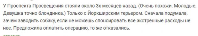 Неравнодушные люди в соцсетях распространяют сообщение о двух молодых людях – парне и девушке, выпрашивающих деньги у сердобольных прохожих для лечения больного щенка. Ранее они уже были замечены в различных частях города с другими собаками, которым также «требовалась операция». Если им предлагают помощь - оплатить услуги ветеринаров или выкупить животное – не соглашаются. Мошенники дают понять, что их удовлетворят лишь наличные деньги. Петербуржцы обращают внимание, что щенок покоится на руках с высунутым языком, что является верным признаком действия сильных препаратов, которыми его, по-видимому, нашпиговали.