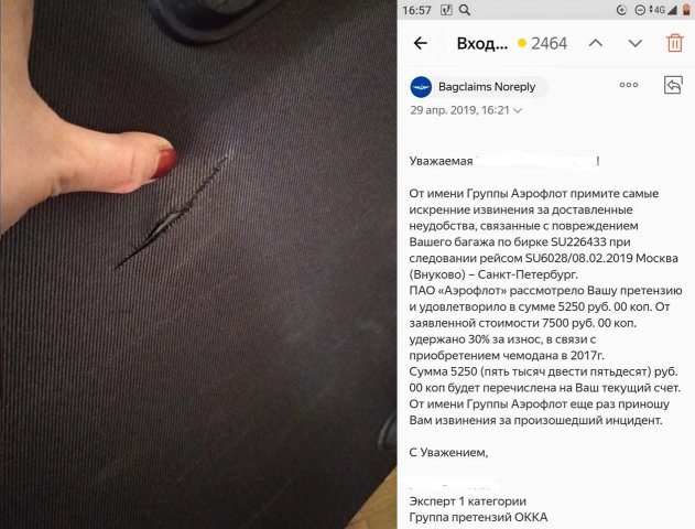 До недавнего времени женщина пользовалась услугами компании постоянно, получая скидки при покупке билетов. Так продолжалось до февраля, когда в аэропорту «Пулково» она при выдаче багажа обнаружила, что её чемодан обезображен внушительным разрезом, при этом, чудом не пострадало его содержимое. Служащие «Аэрофлота» без проблем оформили порчу имущества и заверили, что в самое ближайшее время вопрос с компенсацией будет решён.