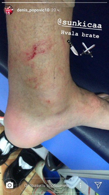В Instagram словенца сегодня появилось странное фото сторис. Попович показал повреждённую в стычке с соперником ногу, отметил Шунича и сопроводил всё это опасными эмодзи в виде ножа и скрещённых мечей. Снимок Денис подписал «hvala brate», что в переводе с хорватского звучит как «Спасибо, брат!». Понятно, что это был сарказм, но то, что он был подкреплён демонстрацией «колюще-режущих» предметов серьёзно настораживает.