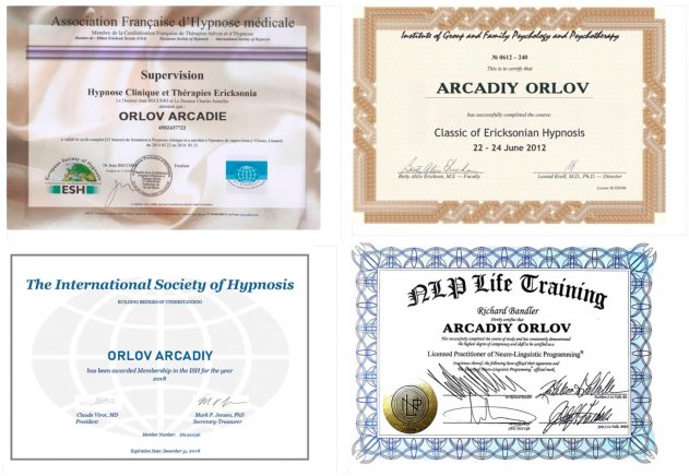 Профессионализм главный автор контента Центра Аркадий Орлов подтверждает 4 сертификатами. Сертификат Французской ассоциации медицинского гипноза – его можно купить, чем промышляют многие «шаманы». При поиске сертификаты и дипломы разного формата оформлены преимущественно на людей со славянскими именами.