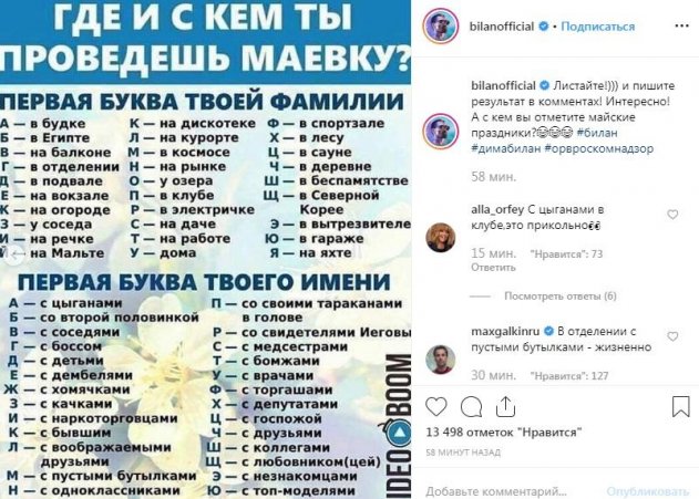 Недавно Дима Билан добавил на своей странице юмористический тест. Он предполагал, что по первым буквам имени и фамилии можно предугадать занятия на майских праздниках, к тому же, список возможных вариантов уже был предоставлен. Внимание привлек не столько пост, который совершенно «не вписывается» в ленту артиста, сколько ответы других знаменитостей. Семейство Галкина и Пугачевой сразу отреагировало на новую запись коллеги и решило ее прокомментировать, правда, ответы у них вышли весьма сомнительные и настораживающие.