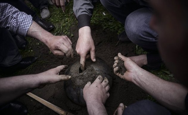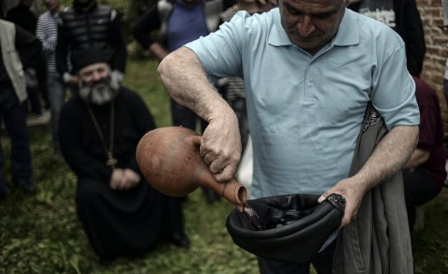 Ночью мяч вручили Гии Имнаишвили, тамаде застолья. Утром его наполнят землей до веса в 16 килограммов (около 35 фунтов), а местный священник отец Саба освятит его, пропитав вином. Пока что он пустует, так что мужчины придали грубой коже форму чаши и наполнили ее вином.